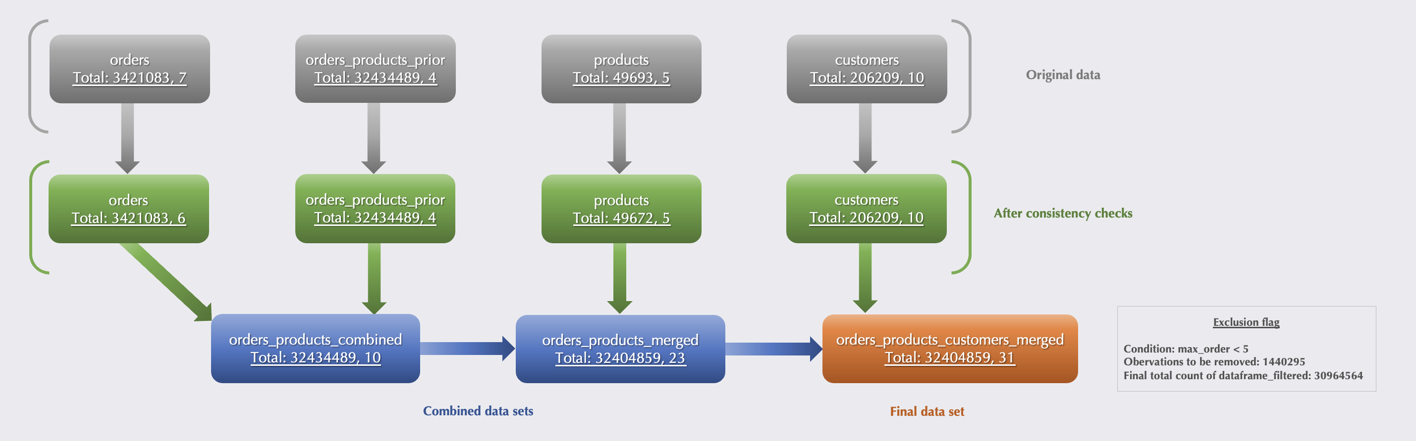 - Merging dataframes: Different data frames were merged using common keys. Merge flag frequencies were analyzed to ensure successful joins and to identify any mismatches.