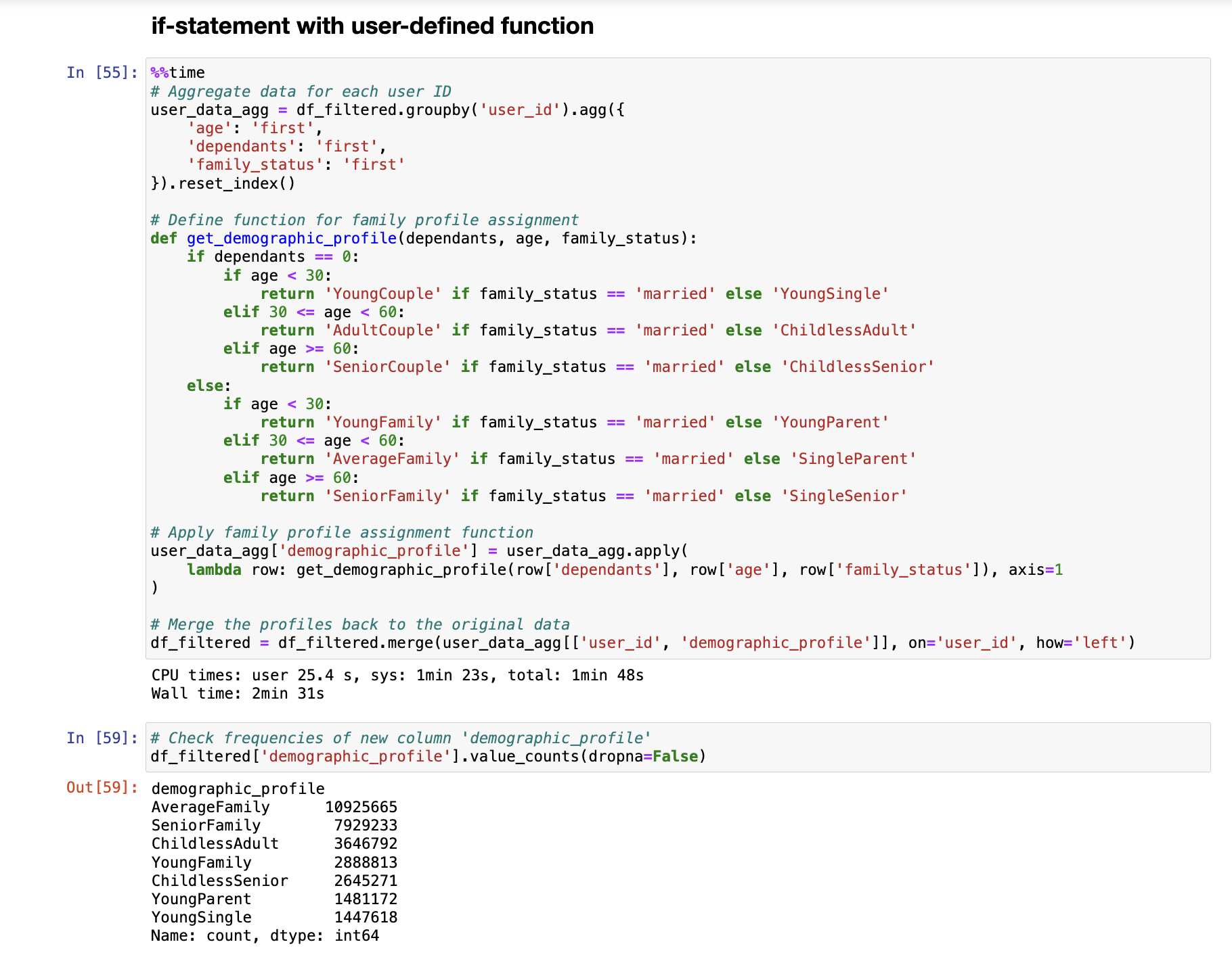- Conditional logic: New columns have been created using if-statements, custom functions, the loc() function, and for-loops. For example, apart from the ones shown below, a column that shows high-value customers based on their total spend.