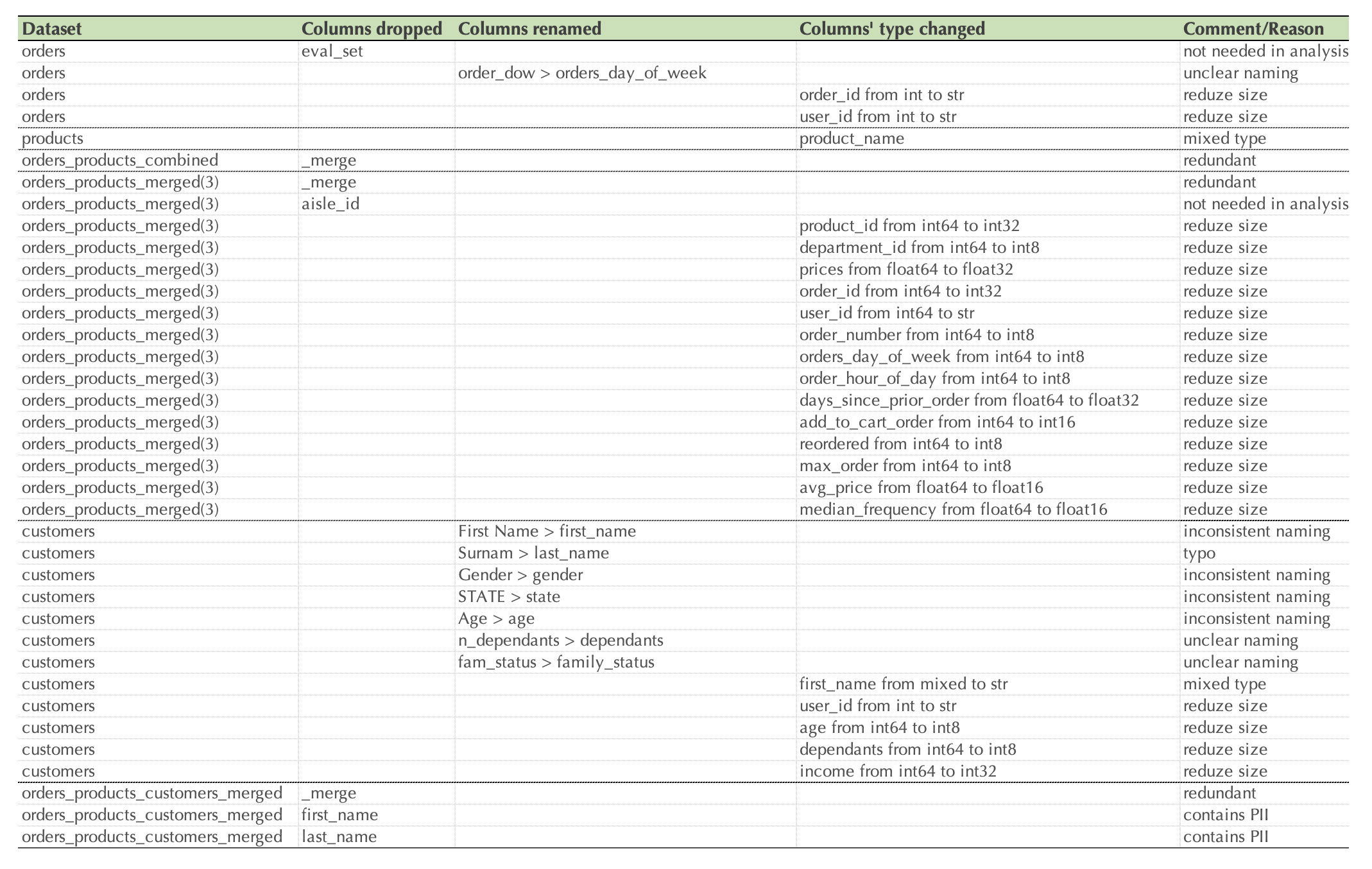 - Data type adjustment and renaming: Identifier variables have been converted to appropriate data types, such as converting numeric IDs to strings for consistency. Columns have been renamed for clarity based on the data dictionary.
