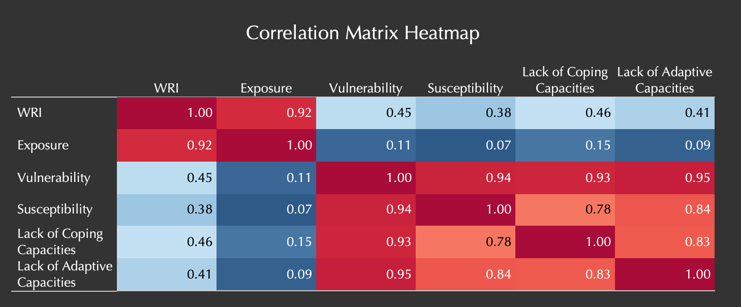 The WRI and vulnerability dimensions also showed a moderate correlation, suggesting a relationship, but not a perfect one.